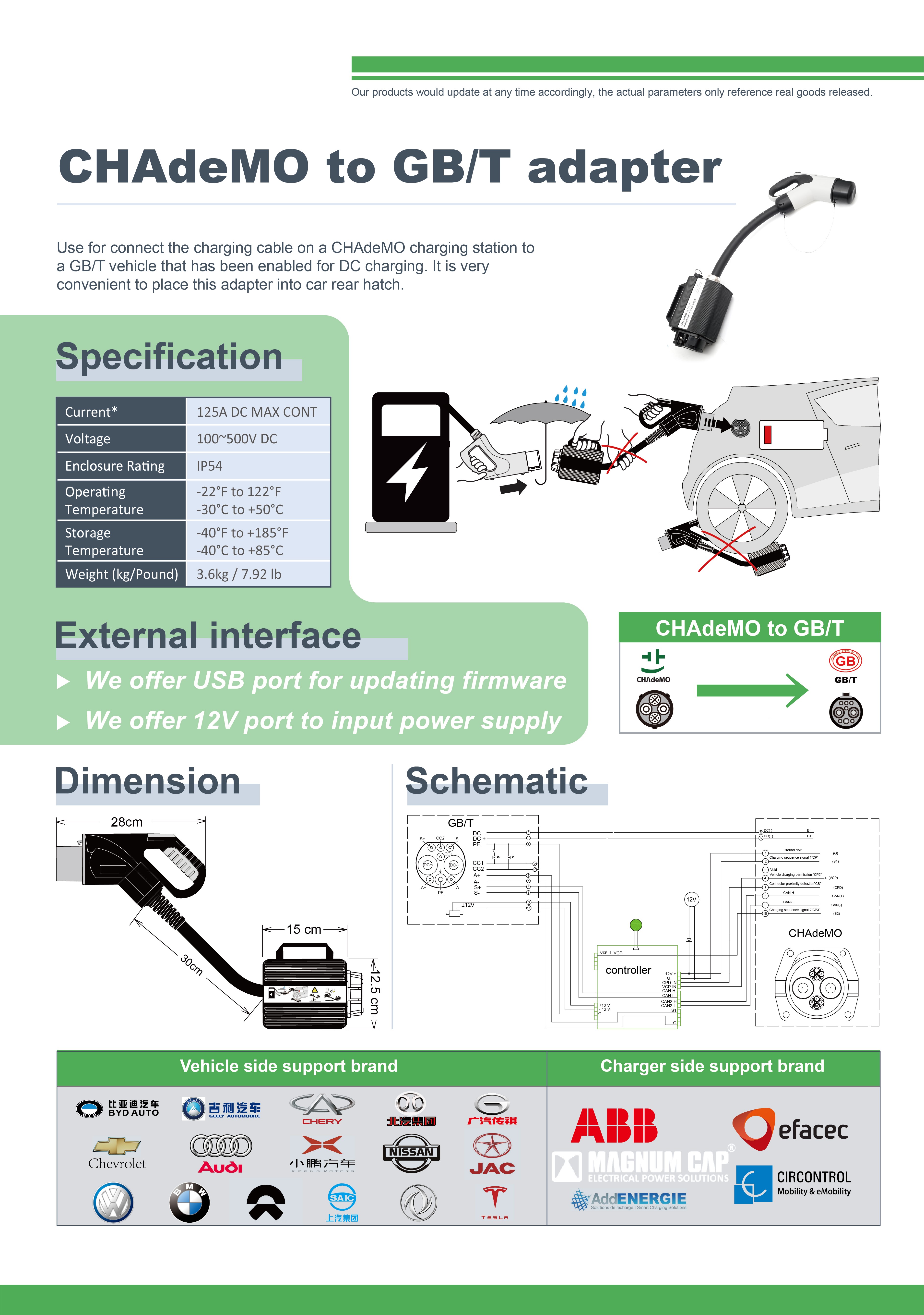 Defnyddiwch ar gyfer cysylltu'r cebl gwefru ar orsaf codi tâl CHADEMO i gerbyd GB / T sydd wedi'i alluogi ar gyfer codi tâl DC.Mae'n gyfleus iawn gosod yr addasydd hwn yn agoriad cefn y car.